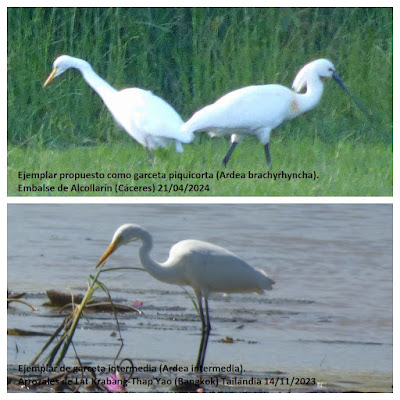 | Comparativa de la garceta piquicorta observada en Alcollarín (Cáceres) el 21/04/2024 con un ejemplar de garceta intermedia fotografiado en Tailandia el 14/11/2023 |